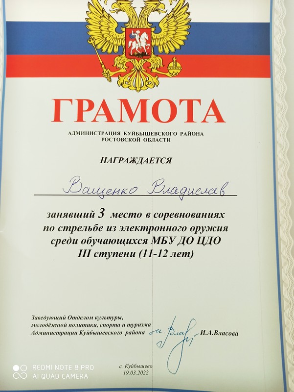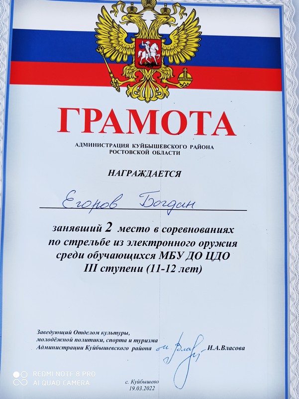 19 марта в Центре дополнительного образования при содействии отдела культуры и молодёжной политики, спорта и туризма Администрации Куйбышевского района состоялись соревнования по стрельбе из лазерной винтовки. Воспитанники детского объединения «Аккорд» приняли в нем активное участие. Двое ребят нашего кружка заняли призовые места: это Ващенко Владислав – 3 место и Егоров Богдан – 2 место.