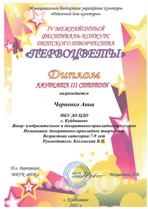Дипломом III степени IV Межрайонного дистанционного конкурса – фестиваля детского творчества «Первоцветы» удостоены работы Черненко Анны и Козловская Дарины;