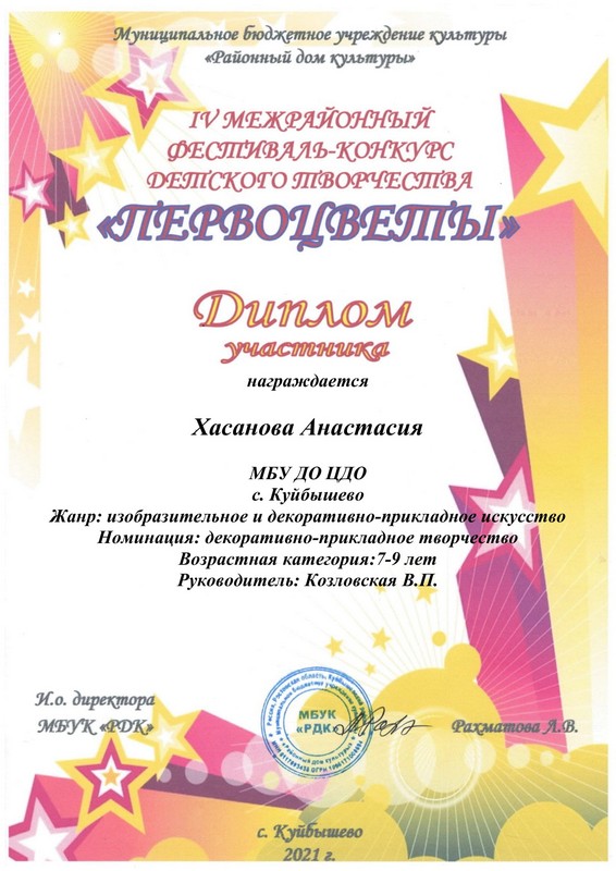 - IV Межрайонном дистанционном конкурсе – фестивале детского творчества «Первоцветы»;