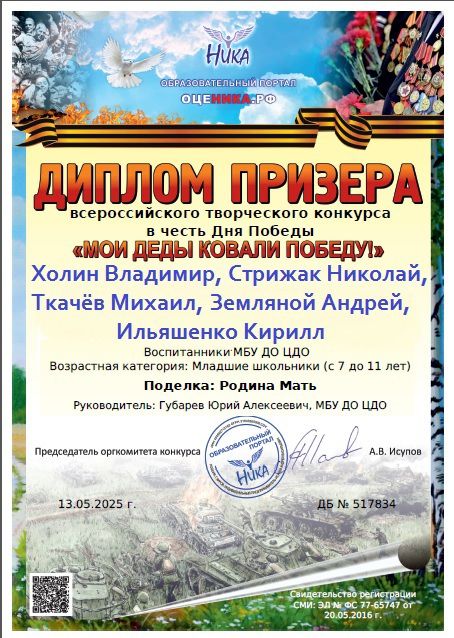 Призёры Всероссийского творческого конкурса в честь дня Победы "Мои деды ковали Победу" образовательного портала оценика.РФ