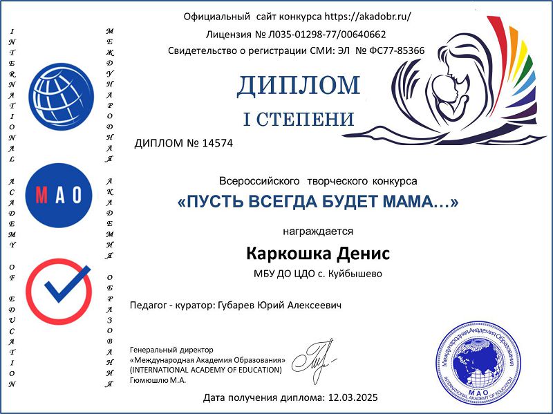 Диплом 1 степени Алексанян Карен