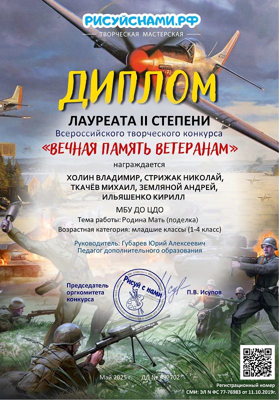 Лауреатами 2 степени в Всероссийском творческом конкурсе "ВЕЧНАЯ ПАМЯТЬ ВЕТЕРАНАМ" творческой мастерской РИСУЙ С НАМИ. РФ с работой "Родина Мать"