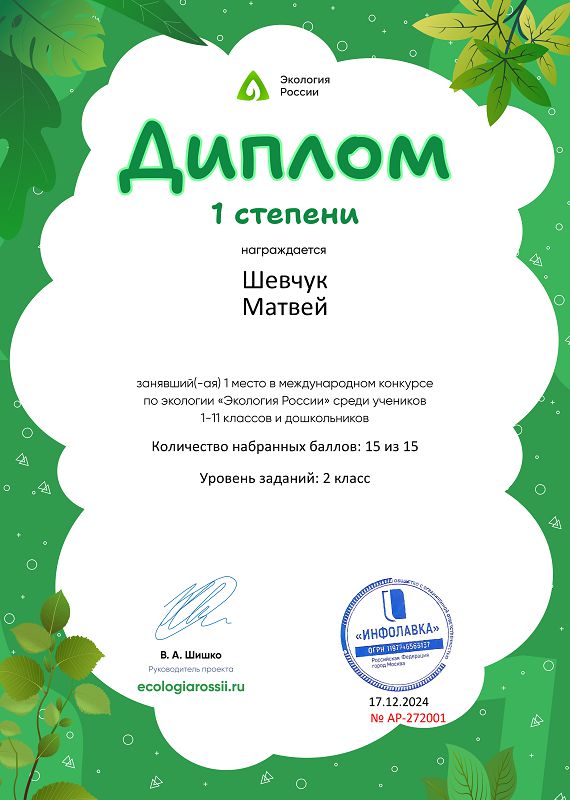 17 декабря воспитанники детского объединения стали победителями конкурса По экологии "Экология России" набрав максимальное количество баллов.