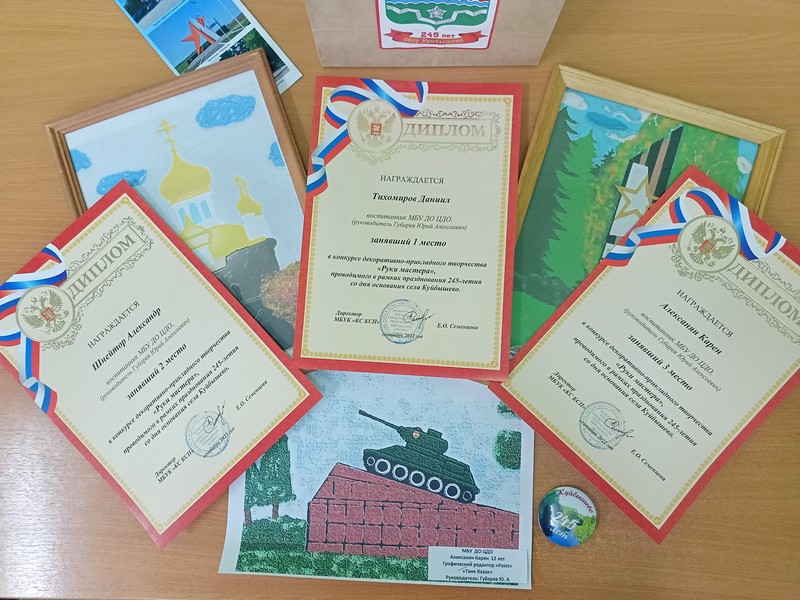 В рамах празднования 245 - летия села Куйбышево ребята детского объединения «Вирус приняли участие в конкурсе декоративно-прикладного творчества "Руки мастера" В результате подведения итогов конкурса Алексанян Карен занял третье место, Шнэйтер Александр занял 2 место, Тихомиров Даниил занял первое место.