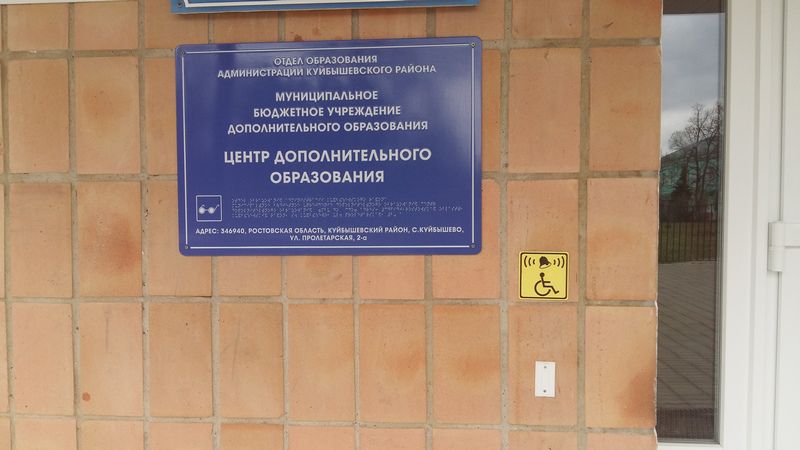 - на входе в здание – наименование учреждения по системе Брайля, тактильная кнопка вызова помощи;