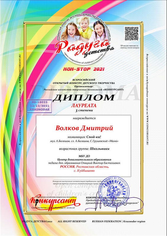 Для детей младшего школьного возраста проводился конкурс детского творчества «Радуга детства». В нем принял участие Волков Дмитрий с песней «Мама». Выступления наших ребят компетентное жюри оценило следующим образом: Копаев Кирилл – дипломант I степени, Волков Дмитрий – лауреат III степени.