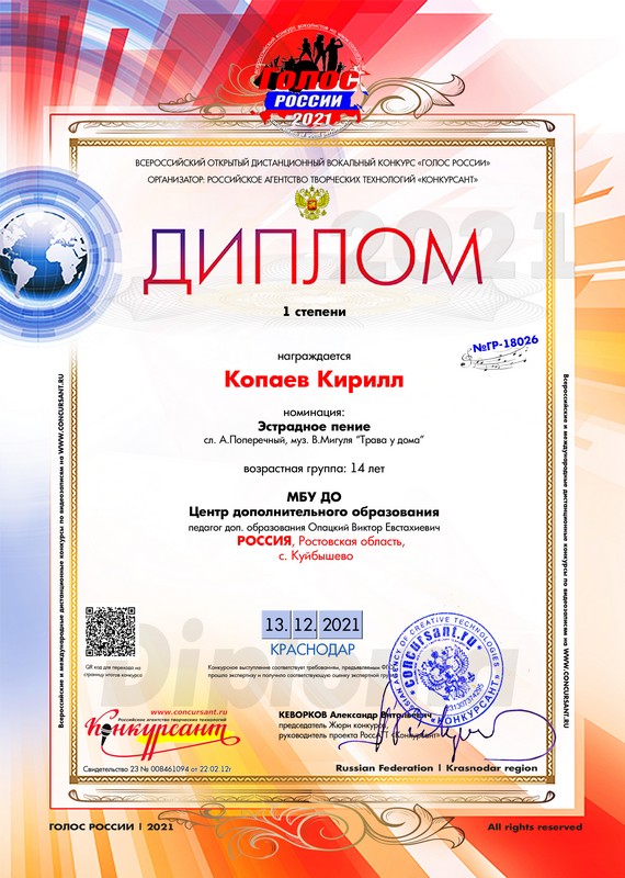 Один из таких – это Всероссийский открытый дистанционный вокальный конкурс эстрадных исполнителей и коллективов «Голос России». В этом конкурсе принял участие воспитанник студии «Аккорд» Копаев Кирилл с песней «Трава у дома».