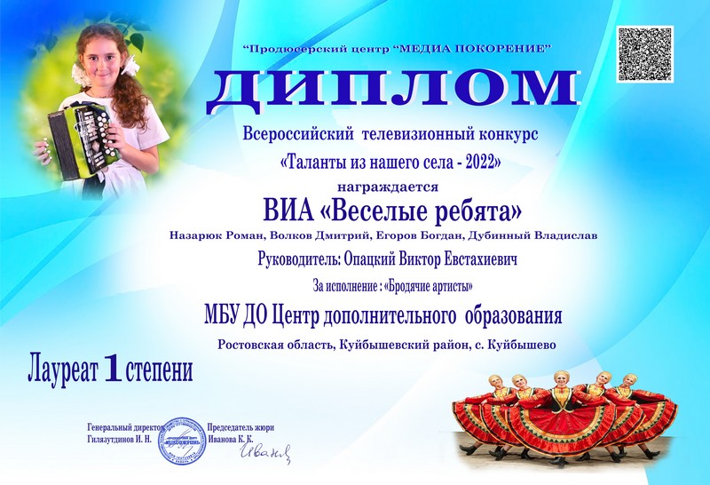 Продюсерский центр «Медиа покорение» ежегодно проводит телевизионный конкурс «Таланты из нашего села». Студия «Аккорд» впервые приняла участие в данном проекте. В конкурсе принял участие ВИА «Веселые ребята» с песней «Бродячие артисты». Состав ансамбля: Егоров Богдан – синтезатор, Назарюк Роман – бас – гитара, Дубинный Владислав – Ритм – гитара и Волков Дмитрий – вокал.
