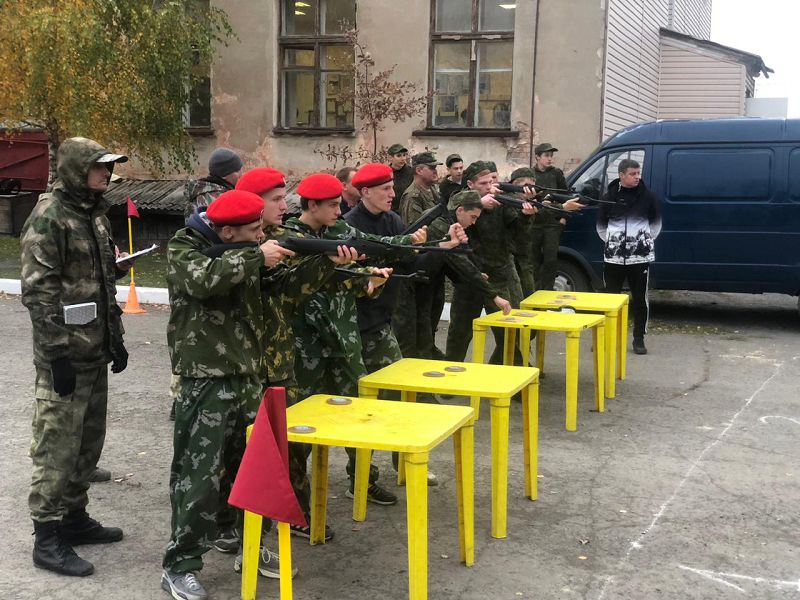 4. Конкурс «Перестрелка» - до огневого рубежа две команды бегут 30 метров, где находятся винтовки. По команде начинается перестрелка, команды должны поразить мишени противника. Выигрывала та команда, которая первой поразила мишени противника.