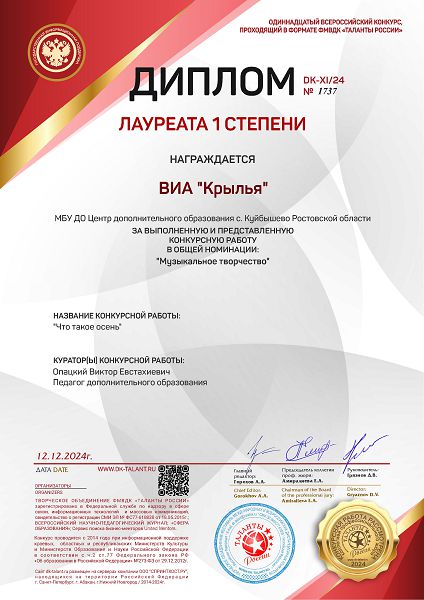 Воспитанники студии «Аккорд» Центра дополнительного образования постоянно совершенствуют свое мастерство. В настоящее время в студии сформированы два вокально – инструментальных ансамбля. Это ВИА «Крылья» ( Копаев Кирилл, Скрынникова Ксения, Давыдова Екатерина и Первун Илья) и ВИА «Ритм» ( Назарюк Роман, Егоров Богдан, Волков Дмитрий и Кущенко Алексей).