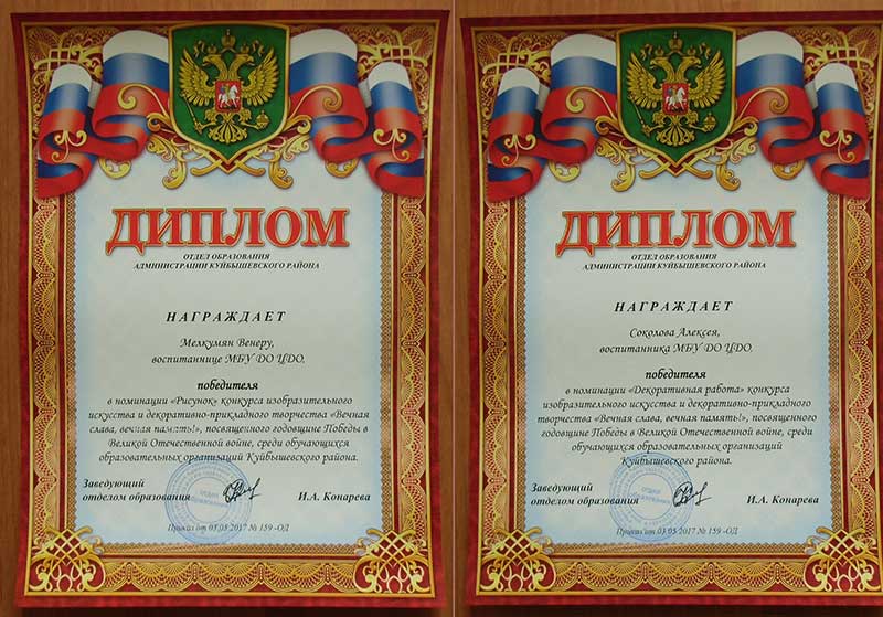 На кануне празднования годовщины Победы в Великой отечественной войне, отделом образования Администрации Куйбышевского района был проведён районный конкурс изобразительного искусства и декоративно-прикладного творчества «Вечная слава, вечная память» В конкурсе приняли участие ребята из кружка «Мелодия цвета». На суд жюри были представлены такие работы как: «Блокадный хлеб» - Мелкумян Венеры, «Наша Победа» - Козловской Александры, «В бою» - Соколова Алексея.