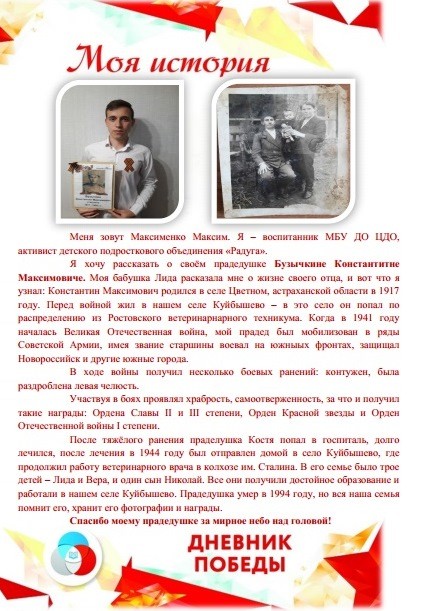 Готовый «Дневник Победы» МБУ ДО ЦДО размещён на официальном информационном ресурсе проекта - публичной странице Ростовского регионального отделения РДШ в социальной сети ВКонтакте и официальном сайте МБУ ДО ЦДО.