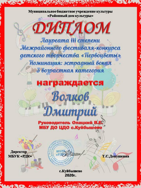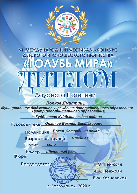 В конкурсе детского творчества «Для наших милых мам», который проходил в Центре дополнительного образования он стал победителем, а в VI Международном фестивале-конкурсе детского и юношеского творчества «ГОЛУБЬ МИРА» был удостоен звания лауреата II степени.