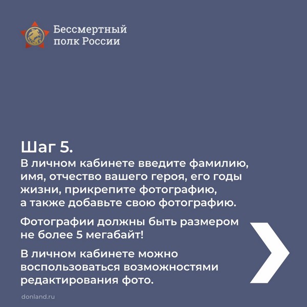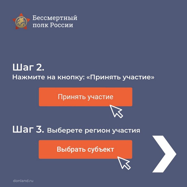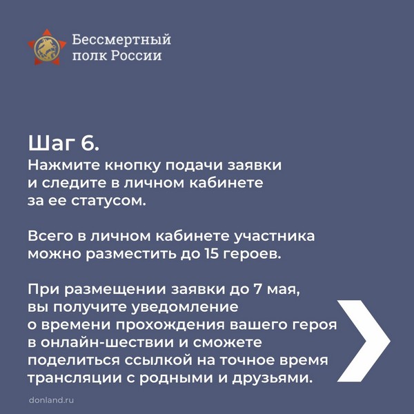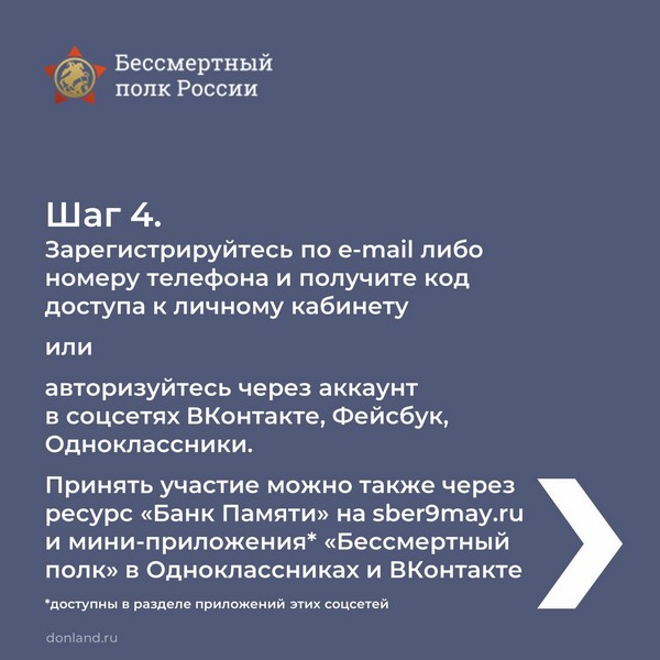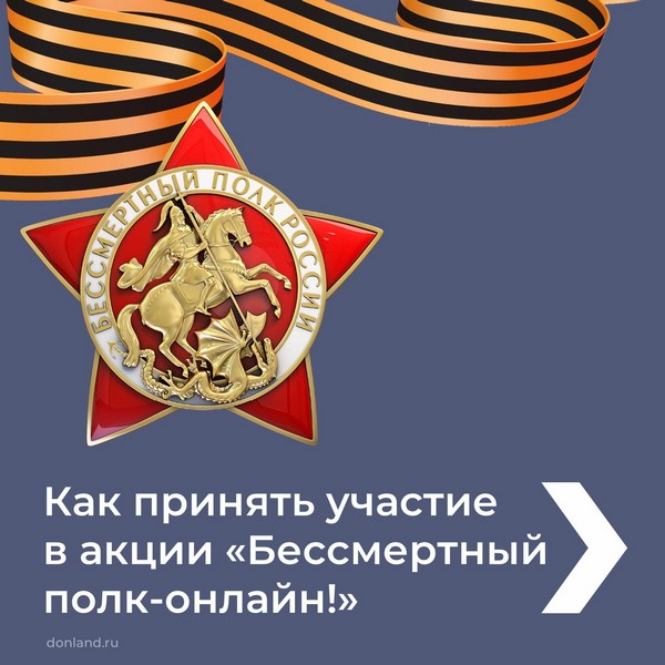 Второй год подряд в силу сложившейся эпидемиологической обстановки в День Великой Победы шествие Бессмертного полка будет организовано в онлайн-формате. Начало трансляции во всех регионах – 9 мая в 15:00 по местному времени. Чтобы ваш герой принял участие в онлайн-шествии и его увидела вся наша страна, необходимо заранее зарегистрироваться. Подробности в карточках, листайте.