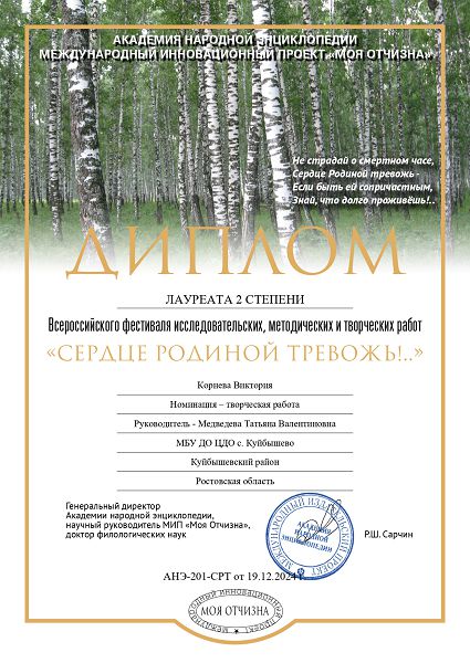 Дипломом Лауреата II степени награждена Виктория Корнева, воспитанница МБУ ДО Центр дополнительного образования.