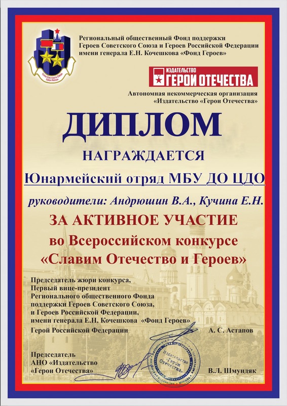 Юнармейский отряд МБУ ДО Центра дополнительного образования села Куйбышево принял участие во Всероссийском творческом конкурсе «Славим Отечество и Героев» в номинации «Чтоб подвиг сделать зримым». В конкурсе приняли участие более 6 тысяч работ.